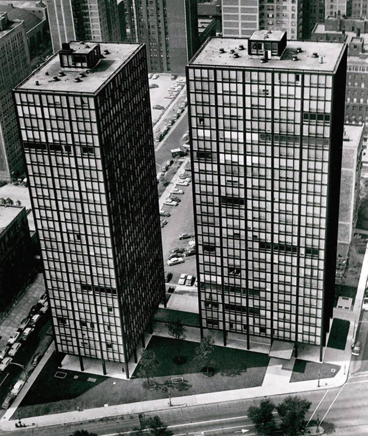 One of the hallmark projects of this period was the Mies van der Rohe-designed skyscraper apartment complex on Chicago’s iconic Lake Shore Drive. These modernist high-rises, completed in the late 1940s and early 1950s, became a symbol of Chicago’s architectural innovation. Designed with clean lines, expansive glass facades, and open interiors, they epitomized the Bauhaus principles of functionality and simplicity.