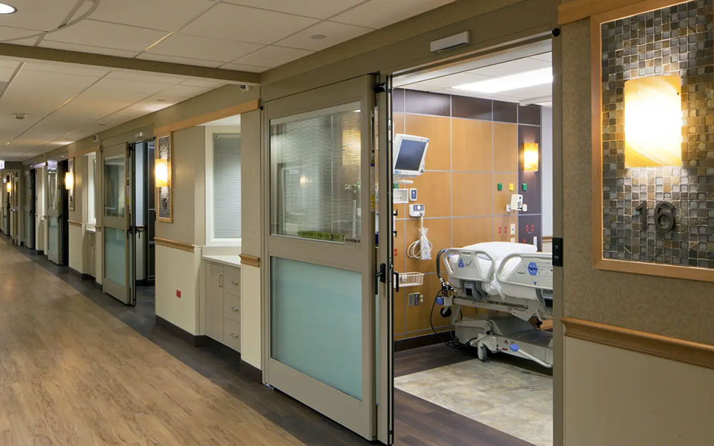 The 2nd floor ICU renovation project consisted of a complete demolition and renovation of the existing 2 South floor. Several new technologies were incorporated into the ICU renovation that addressed infectious control procedures. The copper impregnated countertops at the Nurse’s Station and Patient Rooms using EPA Registered EOScu Preventive|Biocidal Surfaces provided continuous bacteria killing at the source. A similar product used on the project was the Floorfolio vinyl flooring which incorporates a silver infusion that is also a natural germicide. Other innovations incor-porated into the project were high efficiency, low energy sliding patient room doors, “white noise” speakers used to reduce background noise, and plasma I-bars at all of the existing air handlers. I-bars kill 99.8 percent of all germs via ultraviolet light and virtually eliminate all odor.